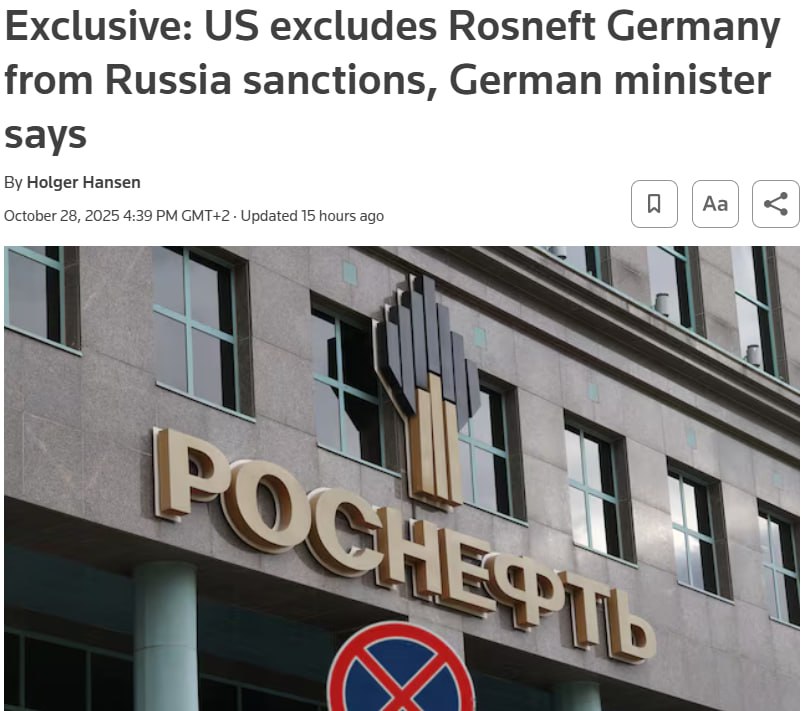 Міністерство фінансів США оголосило в середу, що видало ліцензію, яка звільняє німецький підрозділ «Роснефти» від санкцій США до квітня 2026 року. За інформацією джерел, для Берліна пріоритетним варіантом є отримання постійного звільнення від податкових зобов’язань, однак німецька влада також розглядає можливість конфіскації підприємств з подальшим продажем їх іноземному інвестору.