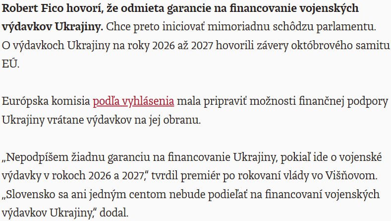 "Я не підписуватиму жодних зобов’язань щодо фінансування військових витрат України на 2026 та 2027 роки. Словаччина не внесе ані єдиного цента на підтримку військових потреб України", - наголосив Фіцо.