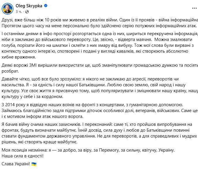 Олег Скрипка спростував слова про підтримку військового перевороту в Україні
