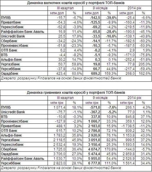 Див. також нижче динаміку вкладів юросіб у ТОП-банків за ІІІ квартал-2015, за 9 місяців-2015 та в 2014 році.