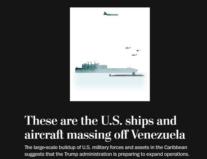 "Збройні сили США в Карибському басейні налічують вісім військових кораблів ВМС, судно спеціального призначення та атомний ударний підводний човен. З прибуттям авіаносця USS Gerald R. Ford до Карибського басейну наступного тижня до них приєднаються ще три військові кораблі та понад 4000 військовослужбовців", - зазначає WP, уточнюючи, що в цьому випадку чисельність американських військ у районі Венесуели зросте до 16 тисяч осіб.