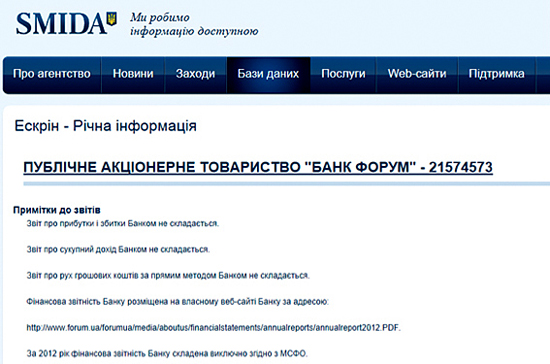 "Форум" - единственный крупный банк в стране, который до сих пор не опубликовал финансовый отчет за 2012 год в полном объеме.