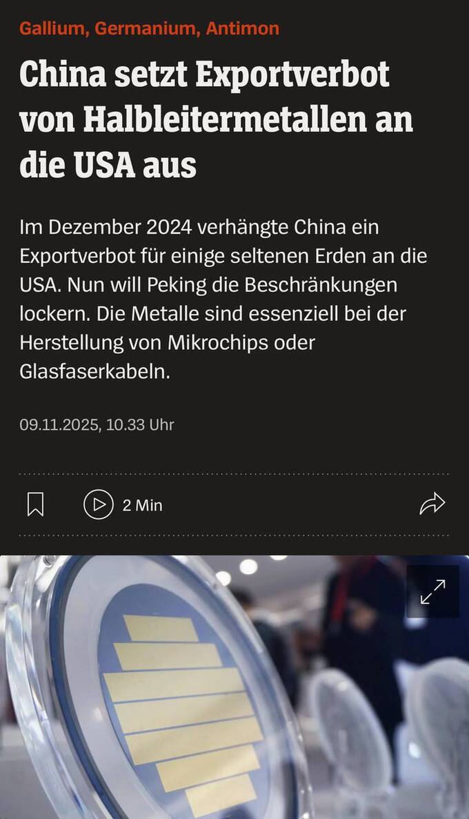 «Пекін зняв заборону на експорт до США галію, стибію та германію — металів, необхідних для створення напівпровідників. США, як і багато інших країн, практично повністю залежать від постачань цієї сировини з Китаю. Наприклад, галій та германій використовуються в мікрочипах, оптоволоконних кабелях і сонячних панелях», - зазначає Der Spiegel.
