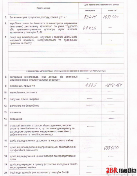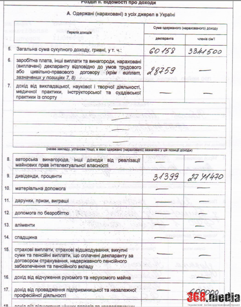 В отличии от супруга, Наталья Рыбакова принесла в семейную копилку 1,94 млн. гривен: 695 тыс. (предпринимательство) и 1,24 млн. гривен (проценты). На банковском счету у нее хранилось 14 млн. гривен.