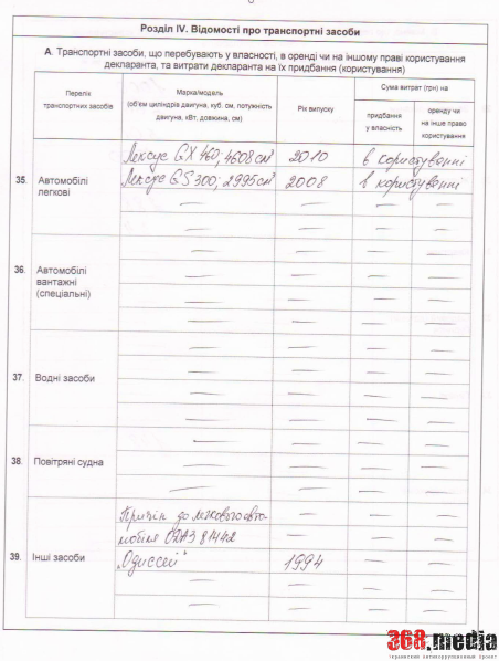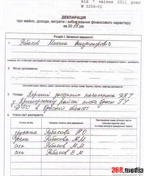 Заместитель начальника ГФС в Одесской области Николай Рыбаков женат на миллионерше и катается на ее иномарках Lexus. Соответствующие данные указаны в его налоговой декларации за 2013 и 2014 годы.