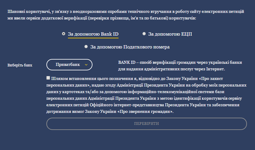 Реєстрація громадянина на сайті займає менше хвилини. Щоб отримати акаунт, спочатку потрібно вказати пошту. Далі система попросить надати персональні дані на вибір — Bank ID, електронно-цифровий підпис або податковий номер. Ця додаткова верифікація даних потрібна «у зв’язку з неодноразовими спробами технічного втручання в роботу сайту електронних петицій», зазначено на сайті. Тобто один користувач може створити багато акаунтів електронної пошти, але друга частина реєстрації виключає можливість підписання петиції одною людиною з різних акаунтів. Жодних повідомлень про фальшування при збиранні підписів ще не було.