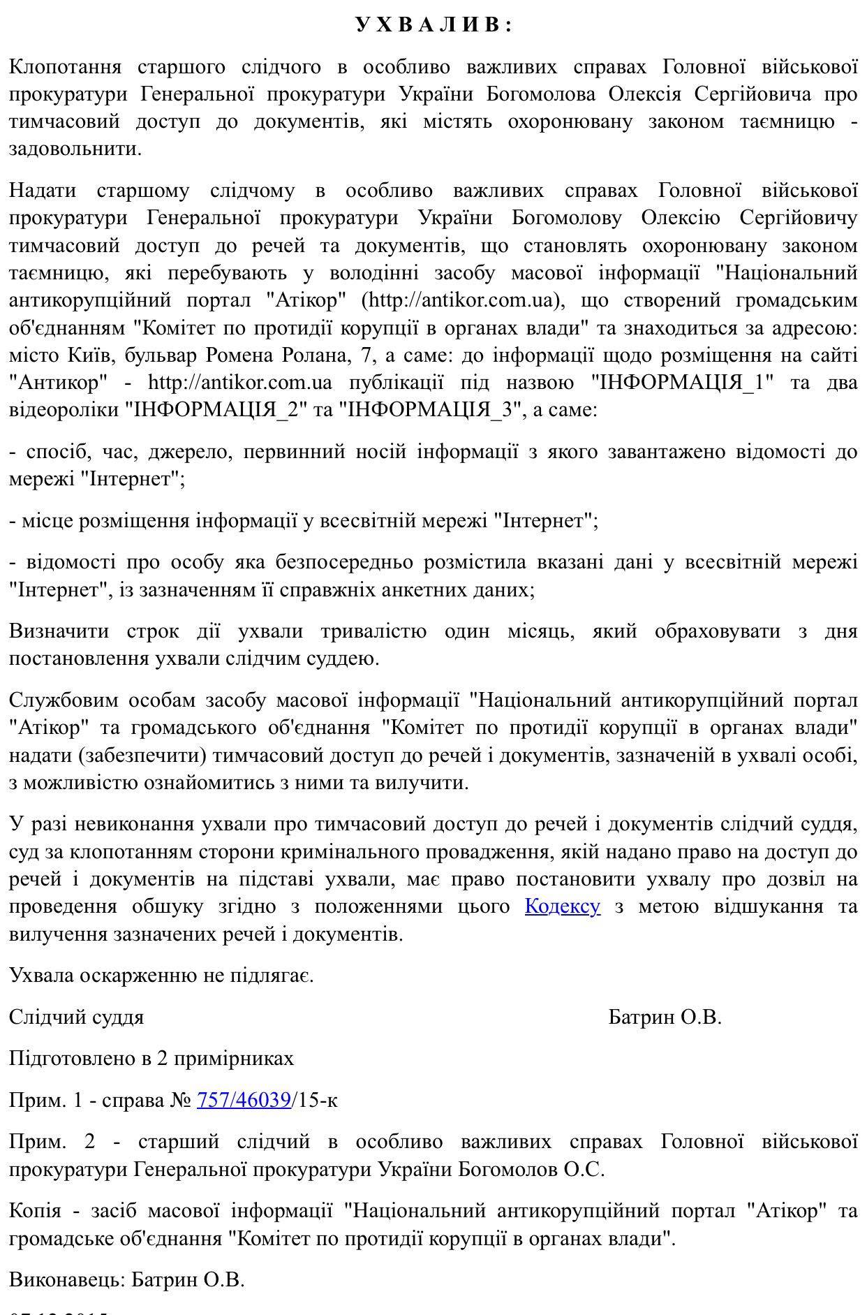 Печерский суд выдал старшему следователю по особо важным делам Главной военной прокуратуры Генеральной прокуратуры Украины Богомолову Алексею Сергеевичу разрешение на временный доступ к документам, которые содержат государственную тайну.