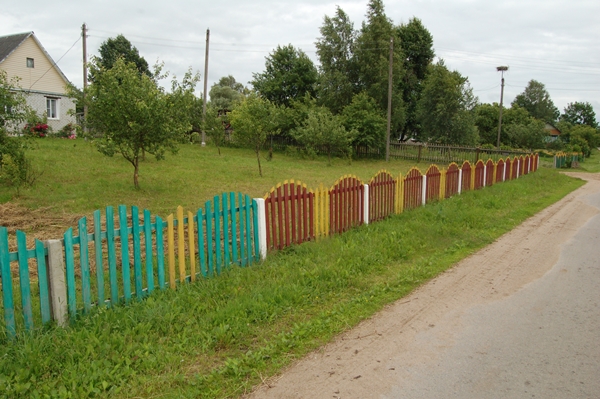 Возвращаясь из Януков, в соседнем Городище обращаю внимание на не совсем характерные для Западной Беларуси заборы. Как поясняют, их спешно ставили перед приездом Януковича местные власти. А чтобы у тогда дорогого гостя создалась иллюзия добровольности одинаковых заборов, владельцам подворий указали покрасить их в разные цвета. Преобладает — жовто-блакитный.