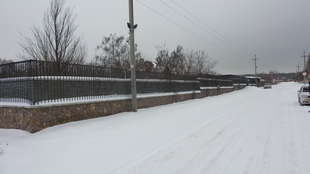 Если бы не зима и опавшие листья деревьев, то нам вряд ли бы удалось рассмотреть хоть что-нибудь, так как вдоль забора в несколько рядов обильно высажены деревья.