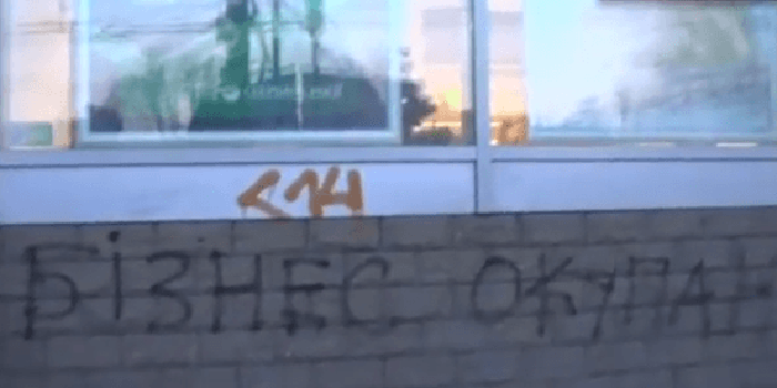 Отдельные активисты испортили фасад здания. Они написали на помещении «Путин» и «Бизнес оккупанта».