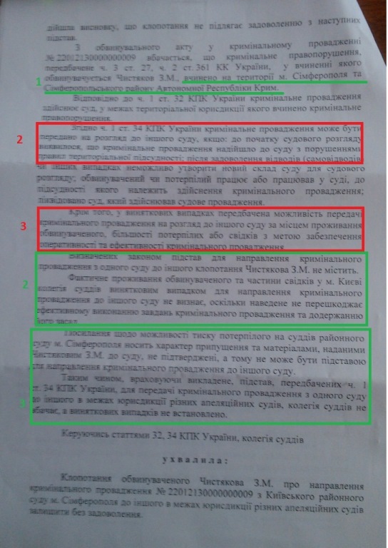 Красным цветом под №1 помечена выдержка из моего Ходатайства, которую судьи обобщили формулировкой «некоторые свидетели проживают на территории Киева», что в корне не верно, поскольку в г. Киев проживает большинство свидетелей. Ну и, естественно, добавили мою уверенность в том, что будет оказано давление на судей. Они все же люди, и проживают в Крыму, который полностью под контролем местной ячейки Партии регионов (которая, якобы, является потерпевшей стороной).