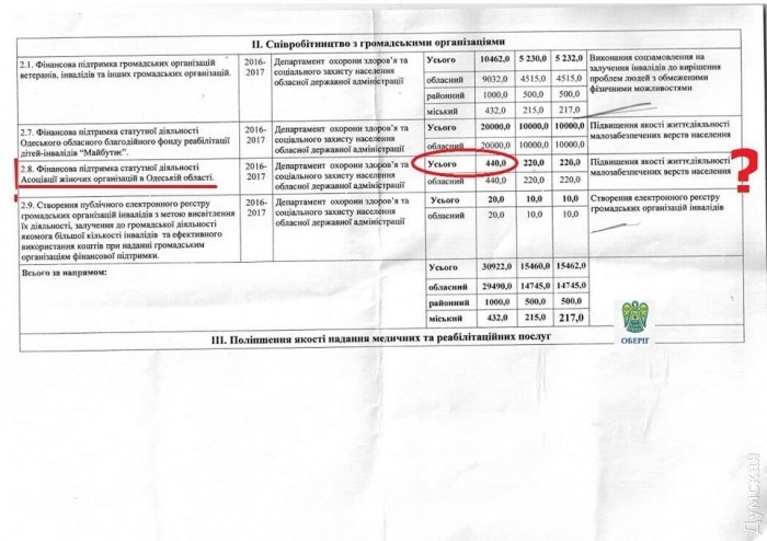 Так, в частности, в течение двух лет из бюджета области планируют выделить 440 тысяч гривен на общественную организацию «Ассоциация женских организаций в Одесской области». Цели, кажется вполне благими: по 220 тысяч в 2016 и 2017 годах названная Ассоциация получит на повышение качества жизнедеятельности малообеспеченных слоев населения.