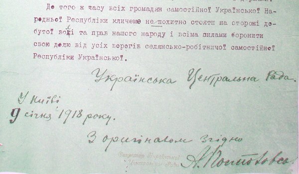 "Отныне Украинская Народная Республика становится самостиной, ни от кого не зависимой, свободным, суверенным государством украинского народа”.