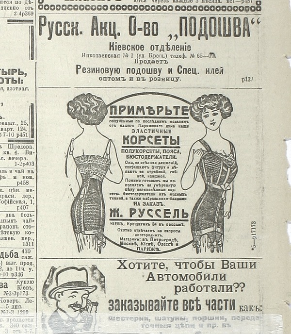 Ж. Руссель приглашал прийти примерить корсеты, полукорсеты и бюстодержатели.