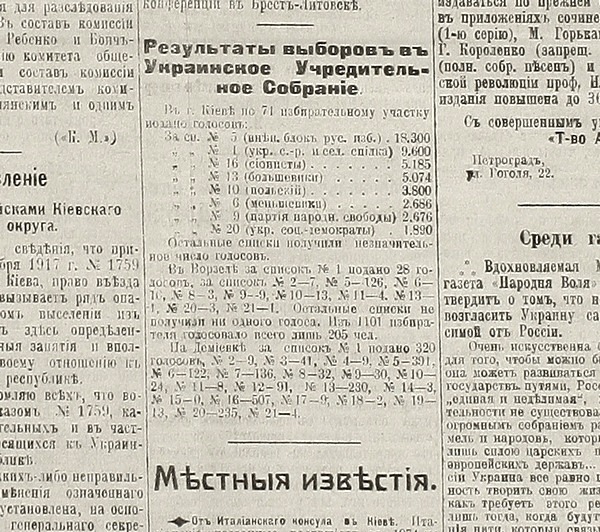 И в определенном смысле - была права: Киев оставался имперским островом, который на выборах в Учредительное Собрание массово проголосовал за “Позапартійний список російських виборців” (Беспартийный список российских избирателей - русск.) - ПСРВ.