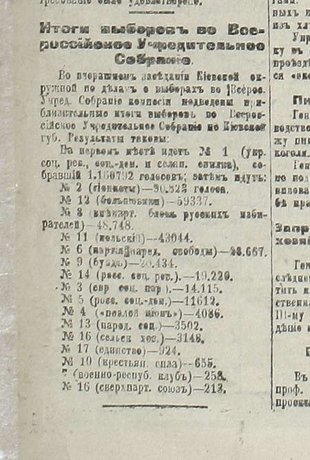 Киевская губерния с огромным преимуществом поддержала различные украинские партии. Но в Киеве ПСРВ получил двойное преимущество перед украинскими партиями.