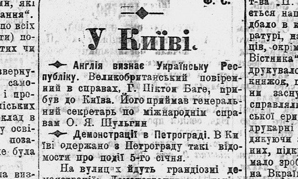 "Англия признает Украинскую Республику. Великобританский поверенный в делах Г. Пиктон Баге прибыл в Киев. Его принимал генеральный секретарь по международным делам А. Шульгин".