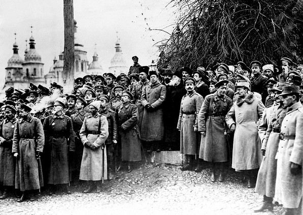 Провозглашение Третьего Универсала на Софийской площади в Киеве. В центра - Симон Петлюра, Михаил Грушевский, Владимир Винниченко. 7 (20) ноября 1917 года