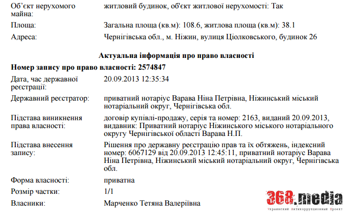 Отметим, что на человека с похожей ФИО зарегистрировано несколько объектов недвижимости в разных концах Украины. Квартира в 25,3 кв. метра находится в Одессе на улице Бугаевская, 16. Еще одна трехкомнатная квартира (64,4 кв. метра) в Харькове получена в наследство в 2005 году. Кроме того, на некую Татьяну Марченко в 2013 году зарегистрирован дом в Нежине на улице Циолковского, 26.