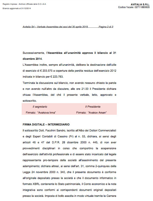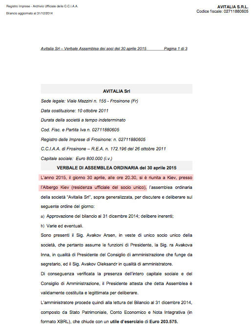 У розпорядженні автора є протокол про збори акціонерів фірми AvItalia S.R.L., які відбулися30 квітня 2015 року в готелі "Київ" у присутності Арсена Авакова та його дружини Інни Авакової.