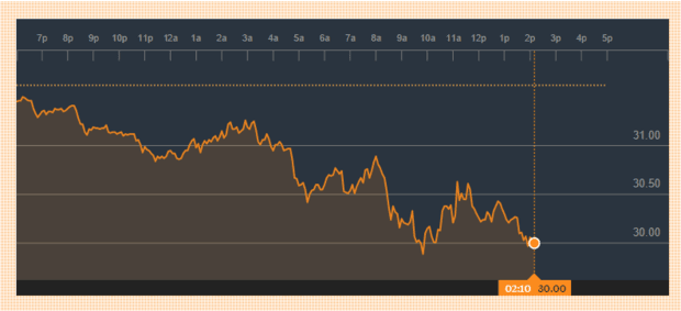Цены контрактов на марку WTI на март на торгах Нью-йоркской товарной биржи (NYMEX) к этому времени уменьшились до $30,00 за баррель.
