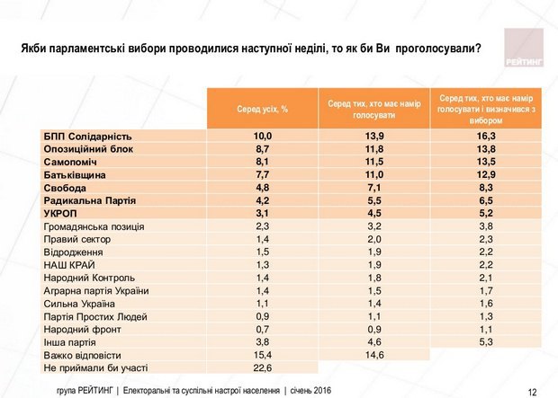 БПП остается самой рейтинговой политической силой в Украине. Однако его поддержка за последний месяц сократилась на 0,2 п.п. - до 16,3%. Другие политические силы постепенно догоняют президентскую партию. Рейтинг "Оппоблока" достигает 13,8%, "Самопомощи" - 13,5%, "Батькивщины" - 12,9%. При этом "Радикальная партия" теряет поддержку, ее рейтинг сократился до 6,5%. Растет рейтинг "Свободы" сейчас он составляет около 8,3%. Партию "Укроп" поддерживают около 5,2% избирателей, готовых прийти на выборы.