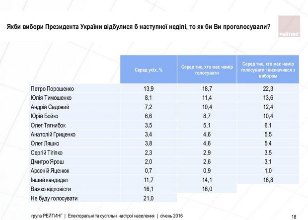 В президентском рейтинге по-прежнему на первом месте действующий глава государства Петр Порошенко. На выборых его поддержали бы 22,3% избираталей. У лидера "Батькивщины" рейтинг 13,6%, у мэра Львова Андрея Садового - 12,4%, у лидера Оппоблока Юрия Бойко - 10,4%, у лидера "Гражданской позиции" Анатолия Гриценко - 5,5%, у лидера "Радикальной партии" Олега Ляшко - 5,4%. За премьер-министра Арсения Яценюка проголосовал бы 1% избирателей.