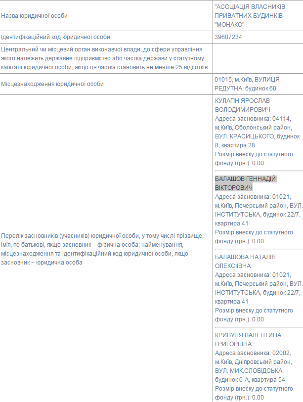 Кроме того, пенсионер Валентина Кривуля является одним из учредителей «Ассоциации собственников частных домов «Монако». Ее партнерами являются: Геннадий Балашов (полный тезка бизнесмена-скандалиста и руководителя политической партии «5.10»), Наталья Балашова и Ярослав Кулагин (баллотировался от партии «5.10», замдиректора «Монолитгидробуд Инвест»).