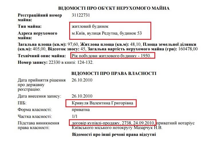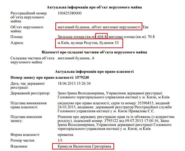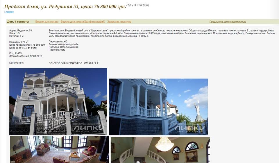 На ее имя оформлена и недвижимость (дом и земля) в престижном районе Киева – Царском селе (Печерские холмы). Дом расположен на улице Редутная, 53. По этому же адресу находится и особняк блондинки Светы, из-за которого у нее был скандал с соседями. Теперь его продают за 76,8 млн. гривен.