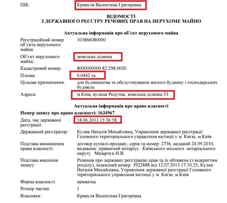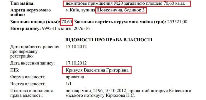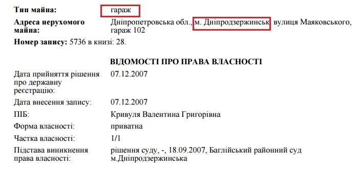 Еще у Валентины Кривули есть нежилое помещения на Шелковичной,3 (70,3 кв. метра), гараж в Днепродзержинске, и 7,76 гектара в Верхнеднестровском районе Днепропетровской области. Эту землю бабушка сдает ООО «Племзавод Любомировка».