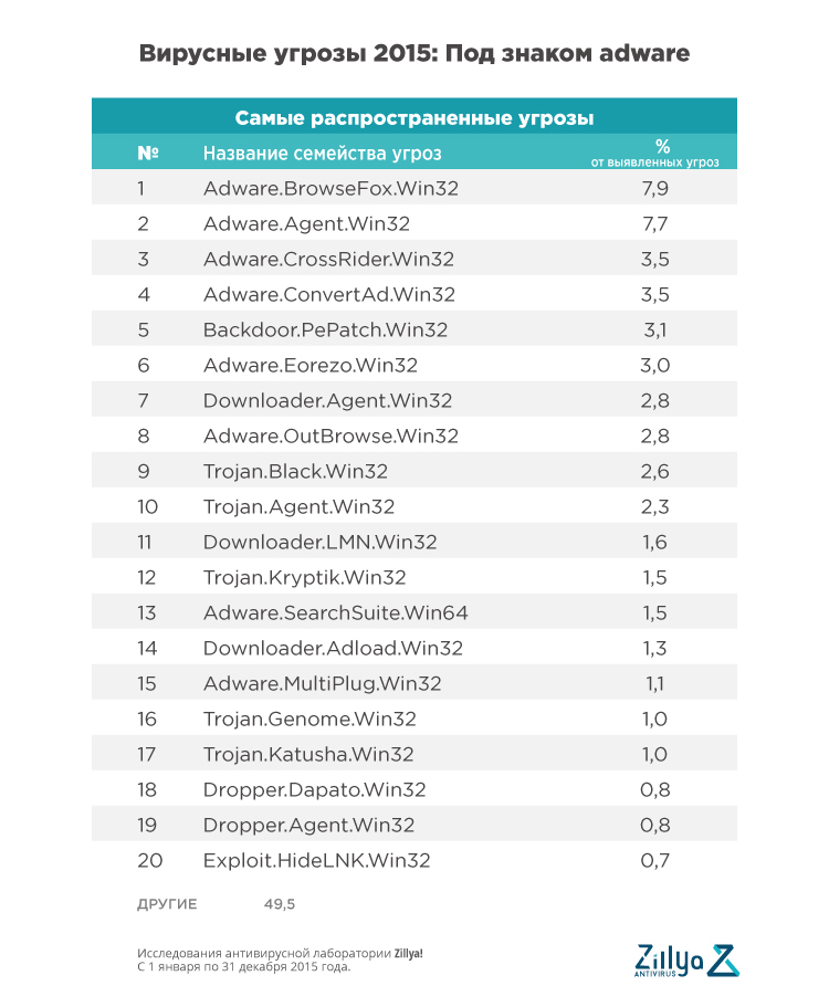 В 2015 году доля Adware составила порядка 49% от общего числа угроз. Наибольший всплеск активности Adware пришелся на четвертый квартал 2015 года, когда количество рекламных модулей в общей массе вирусных угроз в Украине выросло на 17% и достигло 51% доли от общего числа выявленных вредоносных программ.