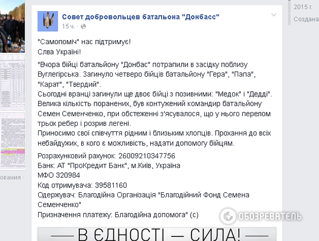 В воскресенье поклонников Семена Семенченко потрясло очередное сообщение из жизни "героического комбата": "31.01 Семен Семенченко участвовал в проведении операции по деблокированию батальона "Свитязь". В ходе операции был контужен. Утром при попадании в ДТП состояние Семена Семенченко ухудшилось", - 1 февраля передал от имени пресс-службы батальона "Донбасс" сам Семенченко на своей странице в Фейсбук.