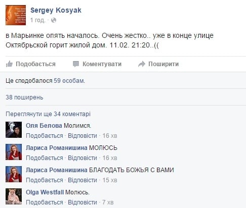 "В Марьинке опять началось. Очень жестко.. уже в конце улице Октябрьской горит жилой дом. 11.02. 21:20", - сообщил Сергей,