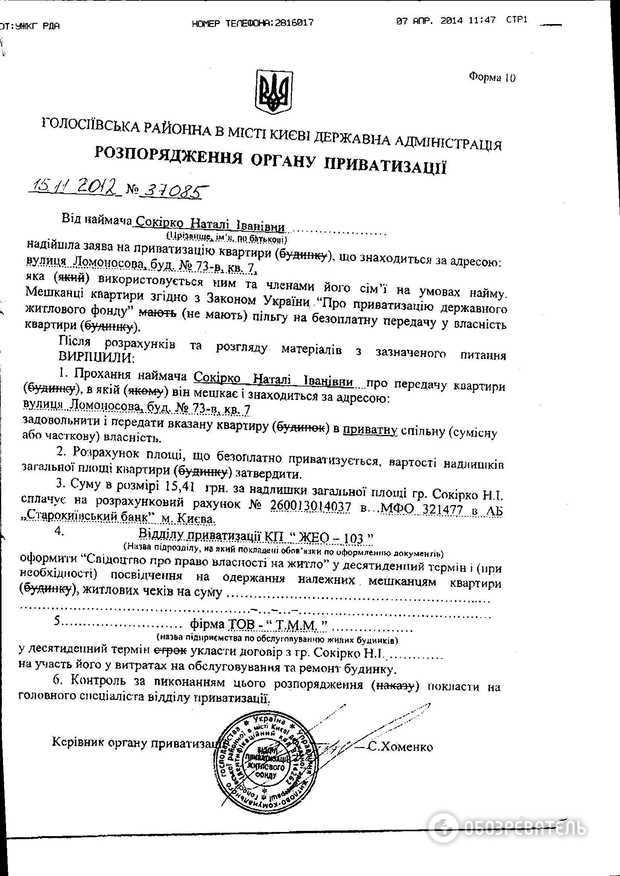 Уже в сентябре 2012 гражданину Сокирко В.П. и его семье из шести человек Соломенской райгосадминистрацией выдан ордер № 018524, серия Б, на жилое помещение по ул. Ломоносова, 73-В, кв. 7, г. Киев, общей площадью 116,6 кв.м.