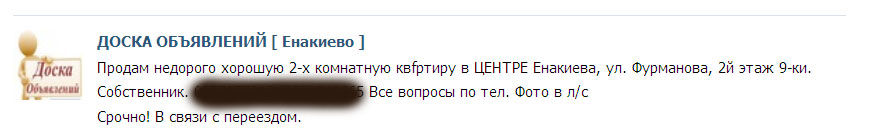 Как сообщают «Комментарии», на доске объявлений в социальной сети ВК опубликовано объявление о продаже квартиры за 10 тысяч гривен.