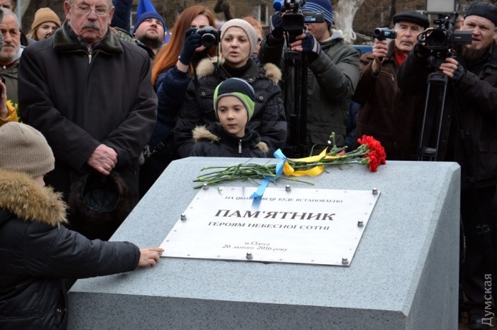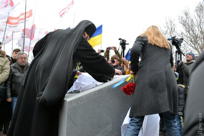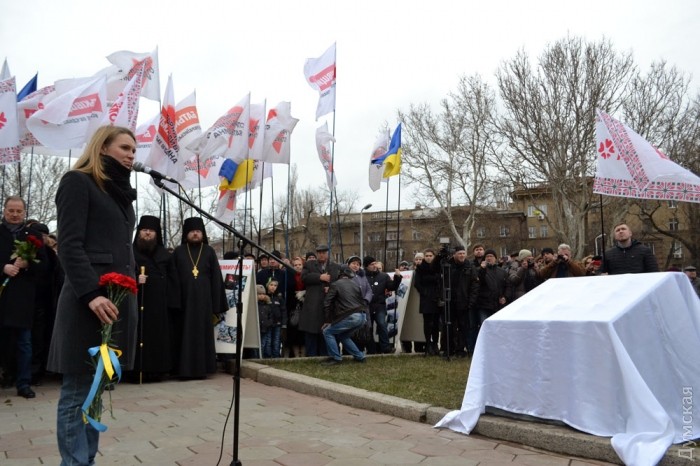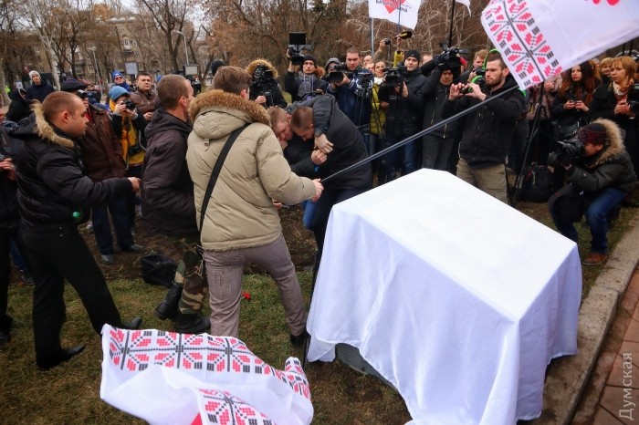 Перед открытием памятного знака слово предоставили председателю Одесского облсовета Анатолию Урбанскому, однако высказать свои соболезнования он не успел, так как «свободовцы» потребовали говорить на украинском языке.