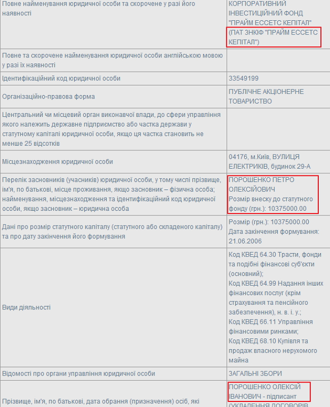 Активы Порошенко заведены на ПАО "Закрытый недиверсифицированный корпоративный инвестиционный фонд"Прайм Эссетс Кэпитал" (ЗНКИФ), созданный в 2005 году. На момент образования он назывался "ЗНКИФ Петра Порошенко", но в 2006 году был переименован.
