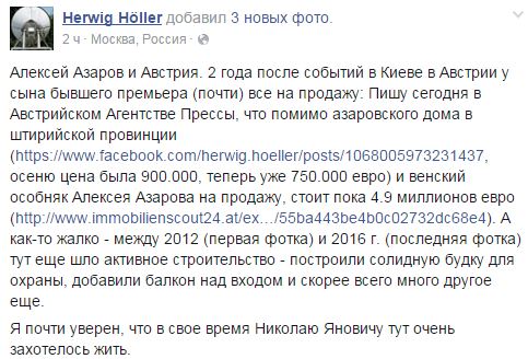 Австрийский журналист Хервиг Хёллер сообщает, что компания L.A.D.A. Holding Anstalt, которая принадлежит Алексею Азарову, выставила на продажу дом в Штрель-Гассе в Вене. Об этом он написал в своем фейсбуке, передает JoInfo.ua.