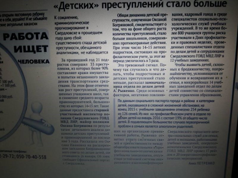 Заслушавших в школах о «героях «новороссии» и их подвигах, дети бегут на фронт. «Беглецы» гибнут на минных полях, даже не достигая линии фронта, гибнут от насилия, потерявших человеческий облик участников добробатов террористов, педофилов, которые просто заполонили оккупированную часть Луганщины. Свердловские и Ровеньковские газеты, остановки заполнены объявлениями о розыске несовершеннолетних.