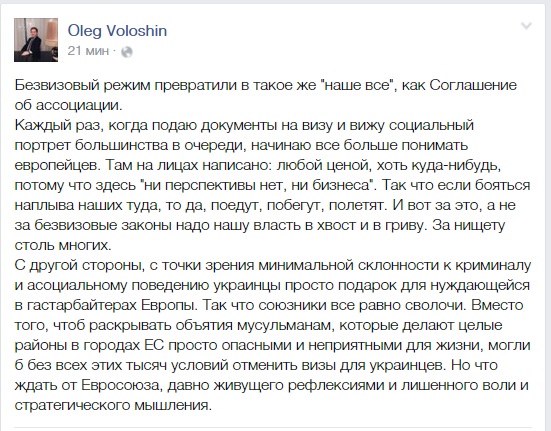 Политолог-международник, бывший директор информационного департамента МИД Украины Олег Волошин написал в Фейсбук о том, как "безвизовый режим превратили в "наше все". Он также отметил, что страхи Европы об украинских мигрантах не беспочвенны, но "с точки зрения минимальной склонности к криминалу и асоциальному поведению украинцы просто подарок для нуждающейся в гастарбайтерах Европы".