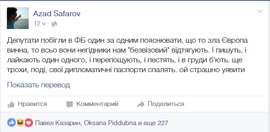 Журналист Азад Сафаров высмеял посты политиков о "злой Европе", которая не дает Украине безвиз. "Еще свои дипломатические паспорта сожгут... ой, страшно представить", - написал он.