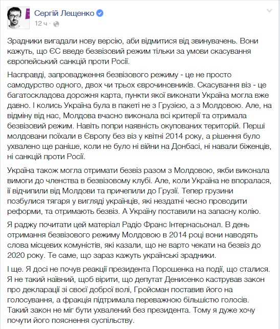 Нардеп от БПП и член группы "Еврооптимисты" Сергей Лещенко отреагировал на пост Денисенко, назвав его "зрадником" (предателем). По его мнению, верссию о том, что для получения безвизового режима необходимо снять европейские санкции против России, придумали "зрадники". И противопоставил Украине Молдову, которая еще в апреле 2014 получила безвизовый режим с ЕС. "Украина также могла получить безвизовых вместе с Молдовой , если бы выполнила требования к членству в безвизовом клубе", - отметил депутат.
