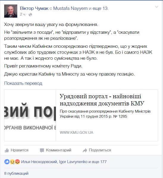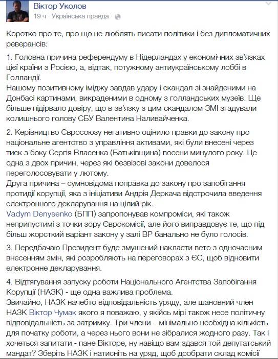 Отреагировал на пост Денисенко также политтехнолог, близкий к Администрации президента, Виктор Уколов. Он отметил, что причина референдума в Голландии - экономические связи с Россией и мощное антиукраинское лобби. Он прогнозирует, что президенту придется наложить вето с одновременным внесением изменений, которые обсуждаются на переговорах с ЕС, чтобы восстановить электронное декларирование. Среди причин, которые мешают получению безвизового режима с ЕС, Уколов назвал нежелание Виктора Чумака сложить депутатский мандат и занять место члена комиссии НАЗК.