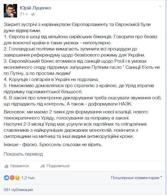 Лученко делает вывод: у Украины есть 2 недели для формирования новой коалиции, нового технократического правительства, голосования за поправку в законе про электронное декларирование. "Иначе - фиаско . Брюссель слезам не верит", - подытожил нардеп.