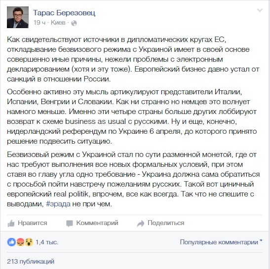 Политтехнолог Тарас Березовец поддерживает версию о том, что безвиз снова откладывается из-за европейских санкций по отношению к России. "Безвизовый режим с Украиной стал по сути разменной монетой, где от нас требуют выполнения все новых формальных условий, при этом ставя во главу угла одно требование - Украина должна сама обратиться с просьбой пойти навстречу пожеланиям русских. Такой вот циничный европейский real politik", - написал Березовец.
