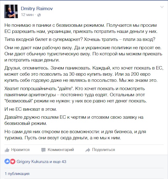 Политтехнолог Дмитрий Раимов призвал соотечественников в Фейсбук перестать "попрошайничать" у ЕС и отозвать свою заявку на получение безвизового режима.