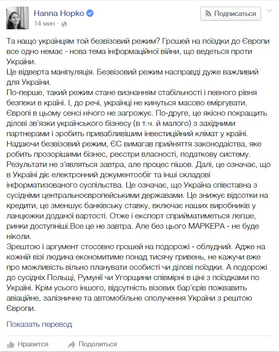 Противоположную позицию в этом вопросе занимает народный депутат Анна Гопко. Она написала, что для Украины поулчение безвизового режима крайне важно - это будет индикатором стабильности и выского уровня жизни в стране. Нардеп осудила тех, кто считает, что украинцам безвизовый режим не нужен и назвала это "новой темой информационной войны".