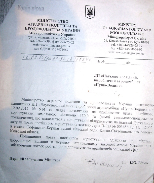 Об истории, заинтересовавшей прокуратуру только сейчас, селяне из Софиевской Борщаговки знали еще с момента проворачивания удивительной аферы, кульминация которой пришлась на декабрь 2012 года. 350 га в Киево-Святошинском районе принадлежали ГП "Пуща-Водица" и относились к особо ценным землям. Благодаря "чуткому" руководству Минагропрома, в чьем ведении пребывает данное ГП, оно постепенно приходило в упадок. В 2011 году пришла очередь отделения предприятия в Софиевской Борщаговке. Тогда, еще до закрытия отделения, носящего название "Совки", из него под предлогом болезни вывезли на скотобойню всех коров (заверял распоряжение о необъяснимой "падучей" скота тогда еще главный ветеринар Украины Бисюк), а все металлические сооружения сдали на металлолом.
