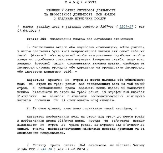 "Незаконные действия чиновника квалифицированы по ч.2 ст 364 Уголовного кодекса Украины, то есть умышленное, в интересах третьих лиц использование должностным лицом власти и служебного положения вопреки интересам службы, что повлекло тяжелые последствия для государственных интересов", - сказано в сообщении прокуратуры Киевской области.