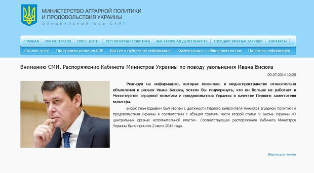 После того, как прокуратура взялась за Бисюка, его бывшее начальство от него открестилось. Швайка так и не нашел времени, чтобы прокомментировать "Обозревателю" ситуацию со своим первым замом. Однако на сайте Минагрополитики появилось уведомление о том, что Бисюка уволили еще 2 июля во время заседания Кабмина "в соответствии с абзацем третьим части второй статьи 9 Закона Украины "О центральных органах исполнительной власти", который гласит: "В случае освобождения министра первый заместитель министра и заместители министра освобождаются от должностей Кабинетом Министров Украины".